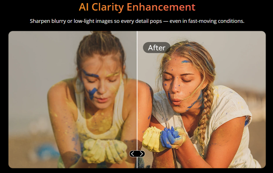 Tính năng AI Clarity Enhancement giúp bạn làm sắc nét những bức ảnh mờ hoặc chụp trong điều kiện thiếu sáng, đảm bảo mọi chi tiết đều nổi bật, ngay cả khi vật thể đang chuyển động nhanh. Nhờ công nghệ AI tiên tiến, hình ảnh của bạn sẽ rõ ràng, sống động và chuyên nghiệp, hoàn hảo cho ảnh chân dung, sản phẩm hoặc cảnh quay hành động.