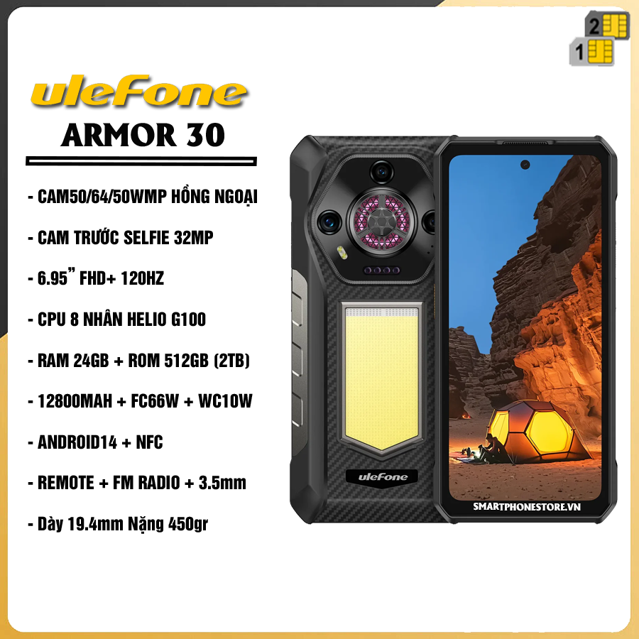Ulefone Armor 30 (36GB RAM | 512GB ROM | Helio G100 | Pin 12800mAh | Android 15) – Siêu Bền Chuẩn Quân Sự, Camera Hồng Ngoại Đỉnh Cao, Màn Hình 120Hz Cực Đại